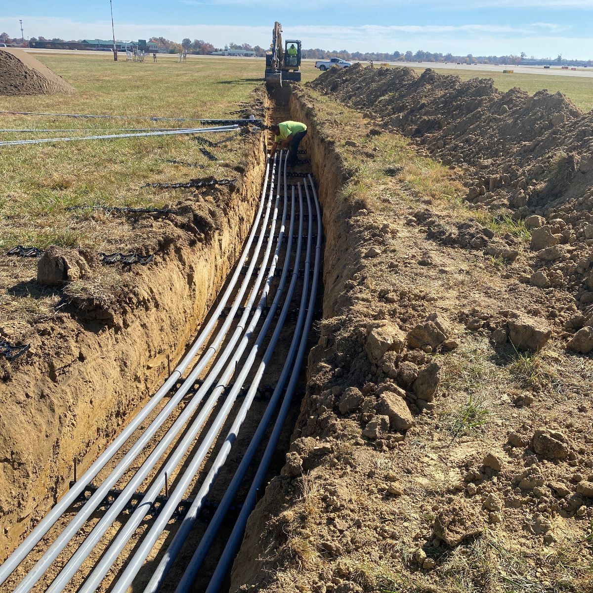 - New duct system for both the west and east airfield comprised of 1-2’’, 2-2’’, 4-2’’, 8-2’’, 10-2’’, 16-2’’, and 24-2’’ ducts. 60,000’ of 2’’ PVC installed total.